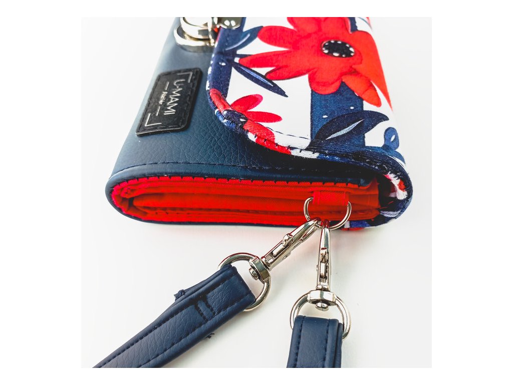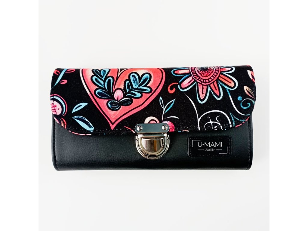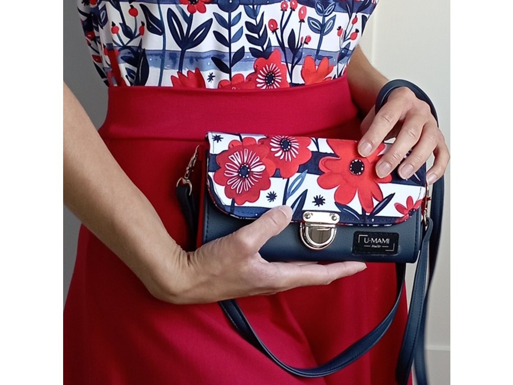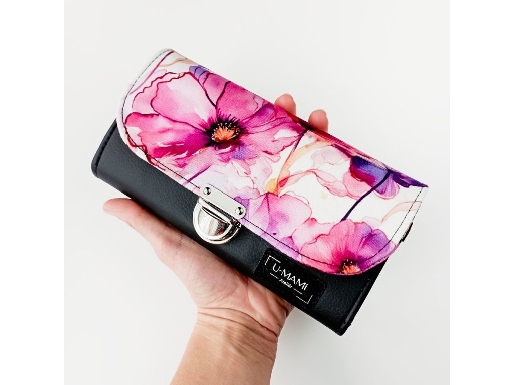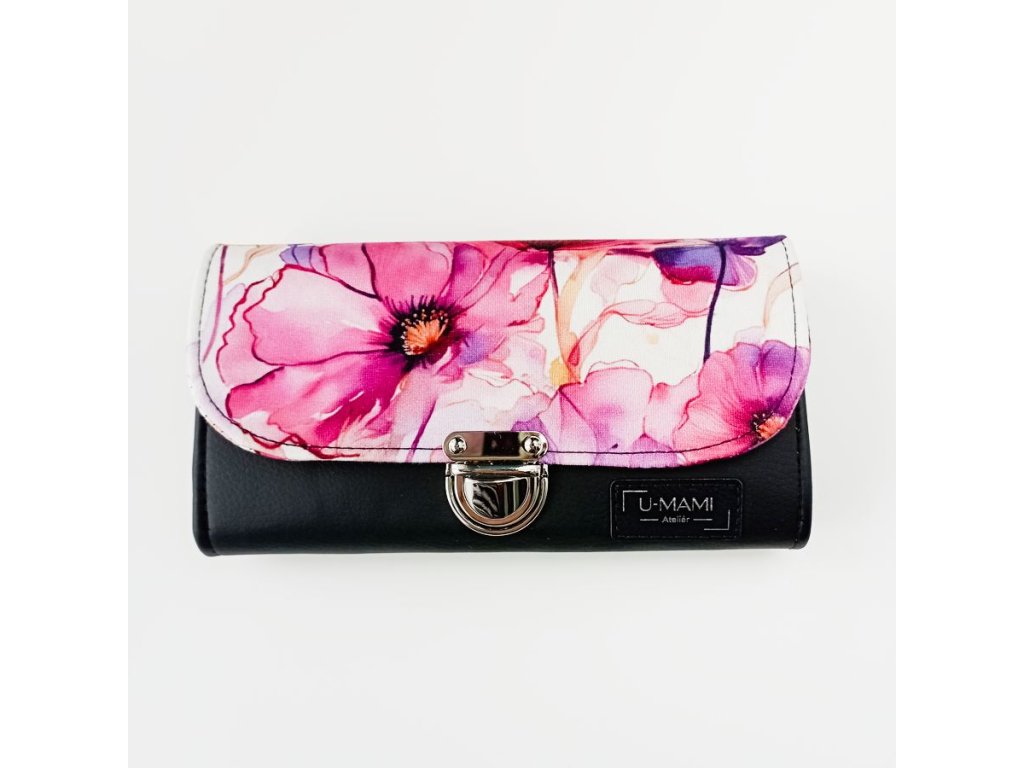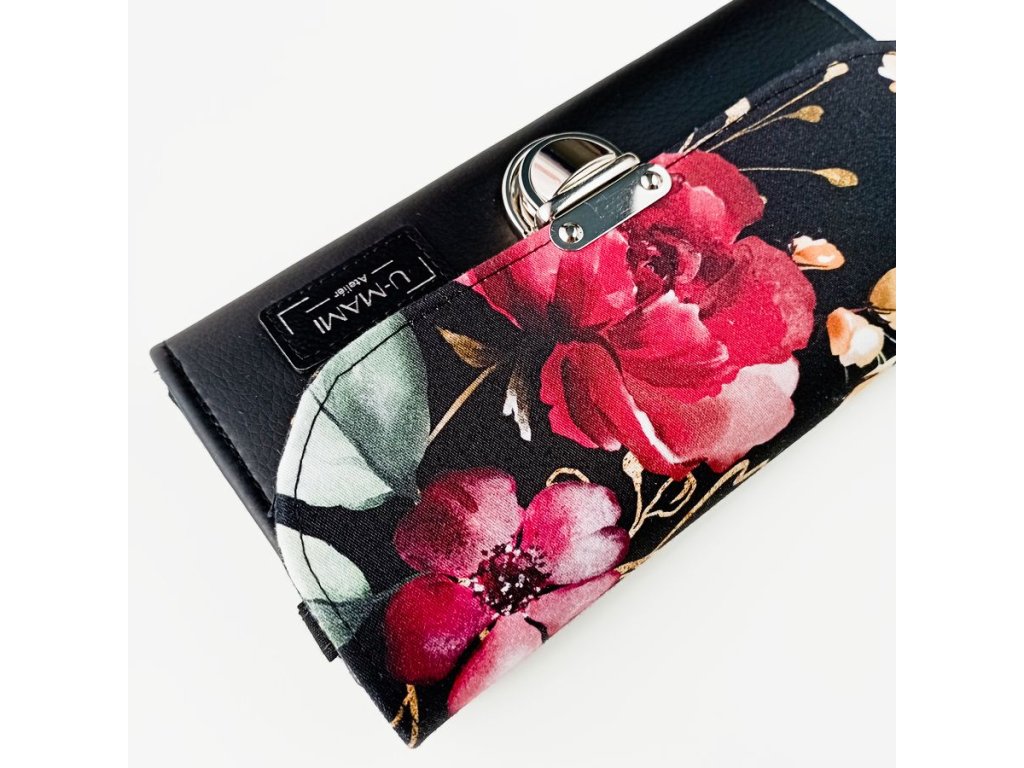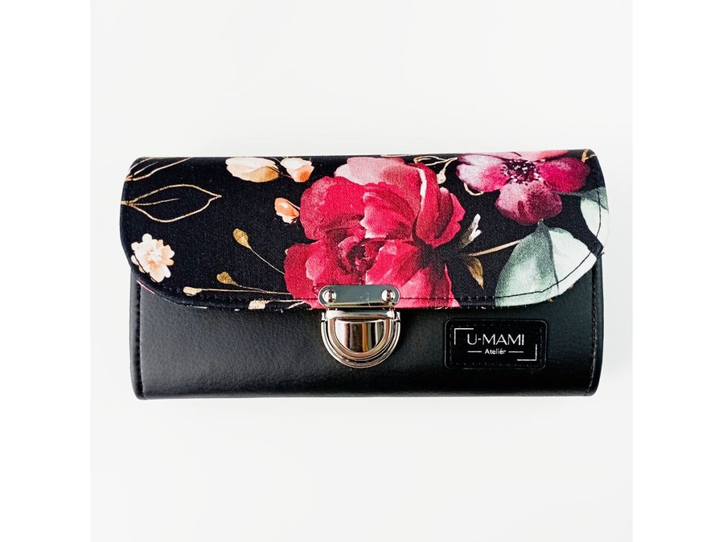 Tato elegantní peněženka z dílny U-MAMI Ateliér kombinuje hravý design a praktické provedení. Svrchní klopa s výraznými červenými květy na kontrastním podkladu přitáhne pozornost a dodá vašemu outfitu svěžest a originalitu.