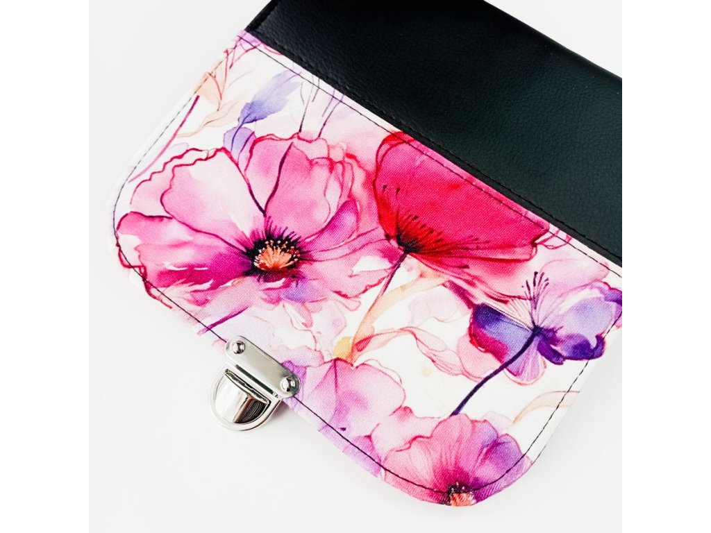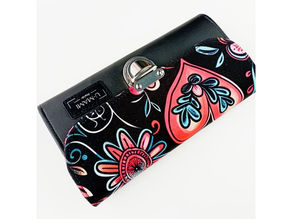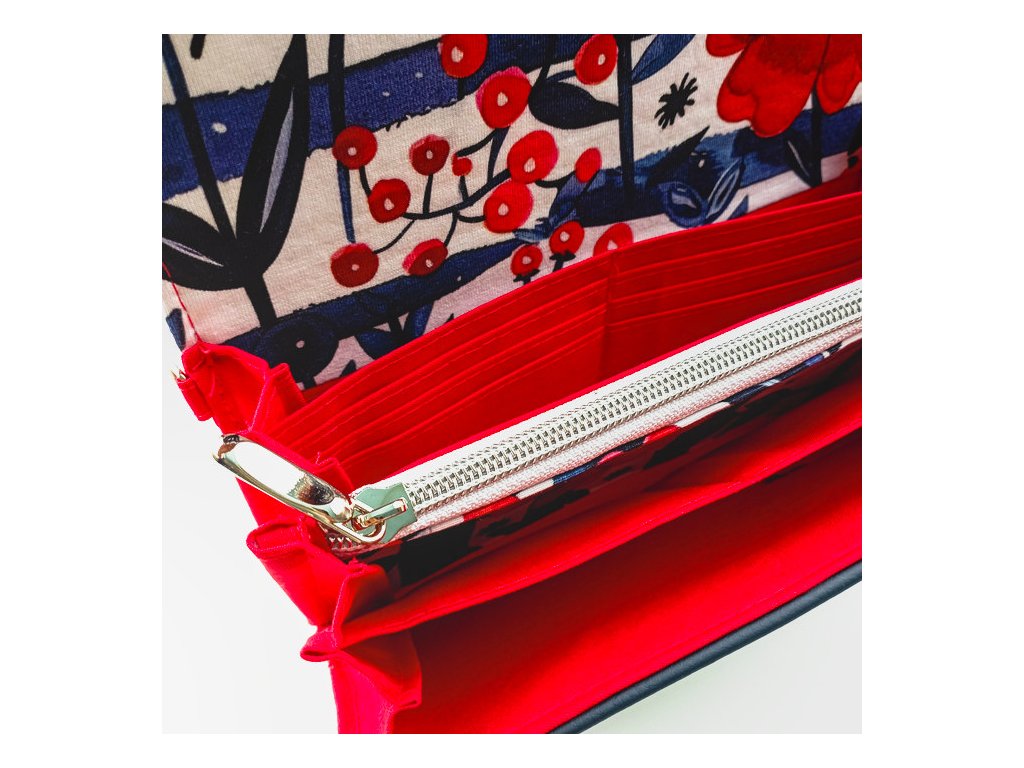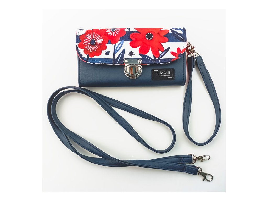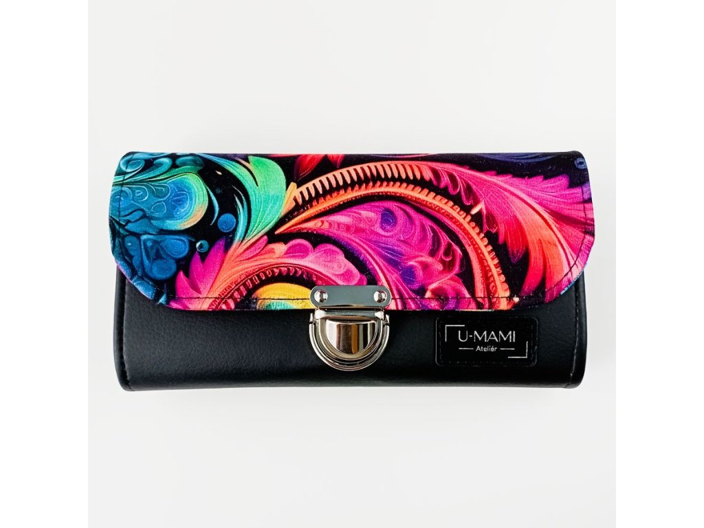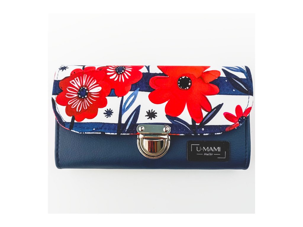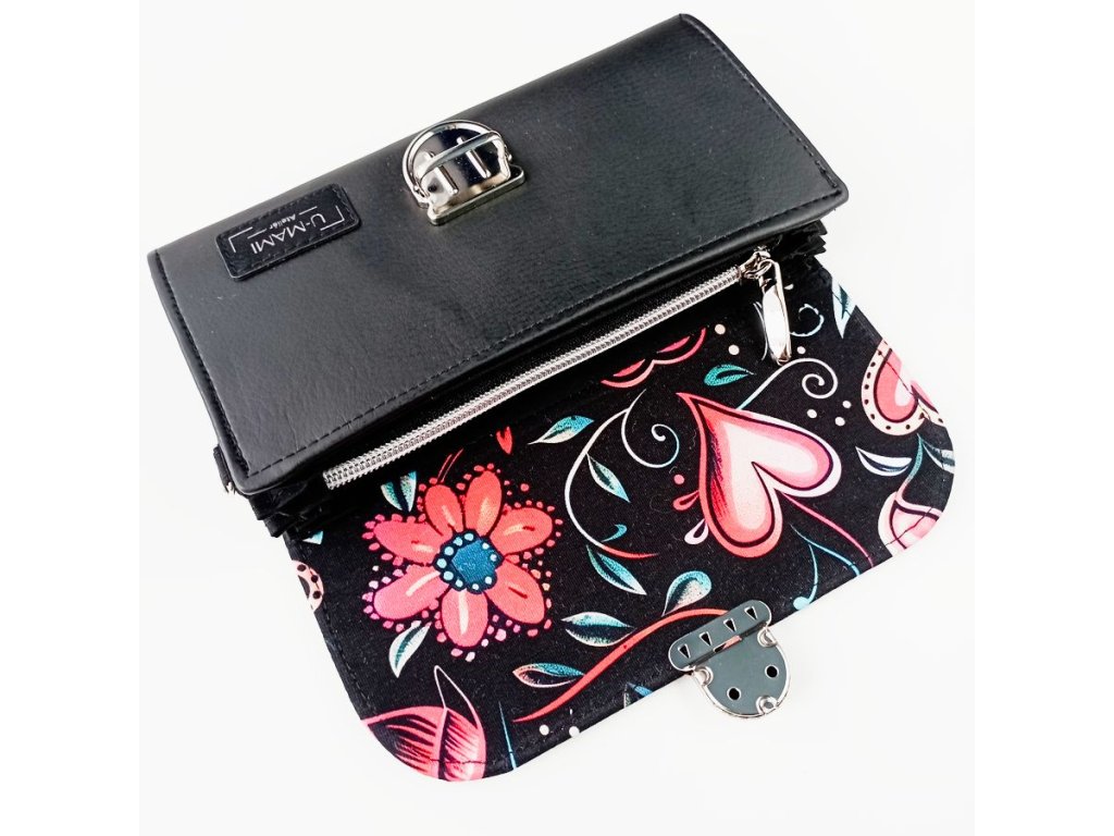 Tato elegantní peněženka z dílny U-MAMI Ateliér kombinuje hravý design a praktické provedení. Svrchní klopa s výraznými červenými květy na kontrastním podkladu přitáhne pozornost a dodá vašemu outfitu svěžest a originalitu.