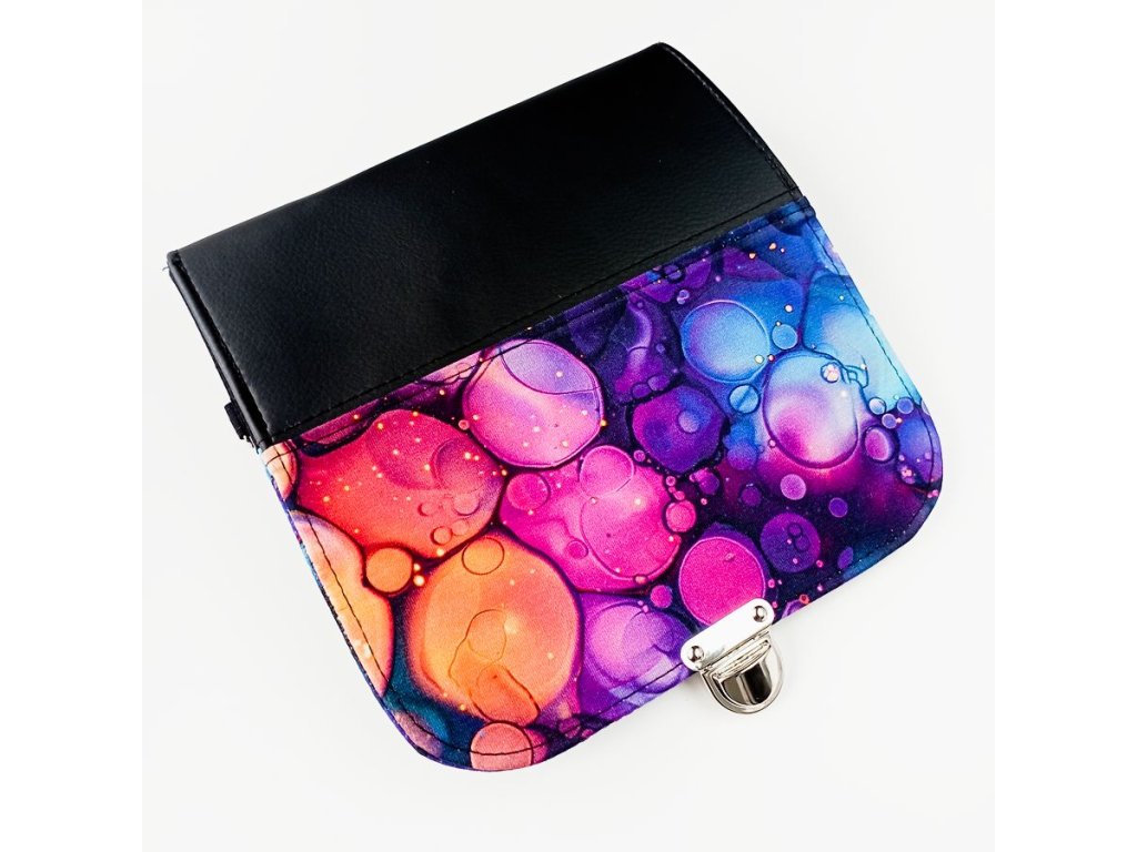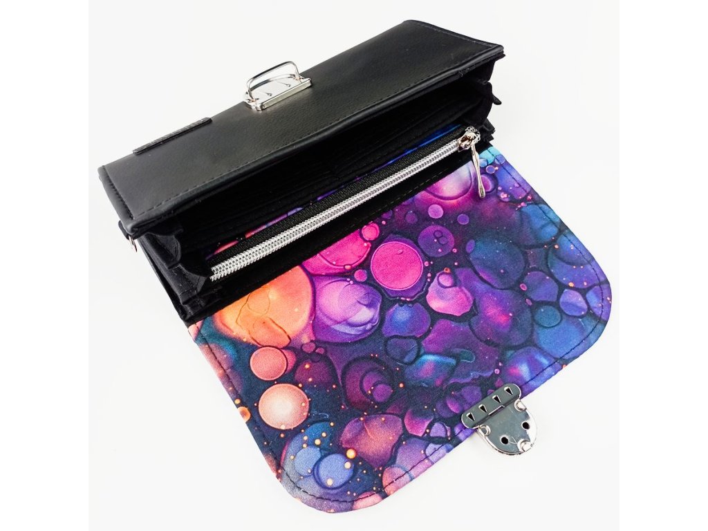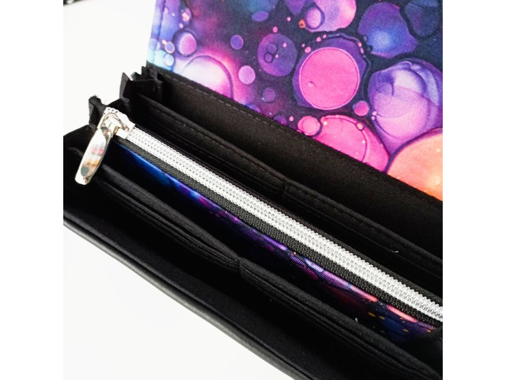 Tato peněženka je malým uměleckým dílem. Vzor inkoustových bublin připomíná okamžik, kdy se kapky barvy dotknou hladiny a začnou se volně prolínat, rozpíjet a vytvářet neopakovatelné tvary. Každá bublina je jiná – stejně jako nálady, emoce a příběhy, které s sebou neseš každý den.