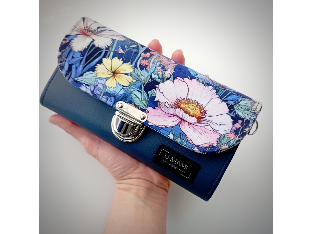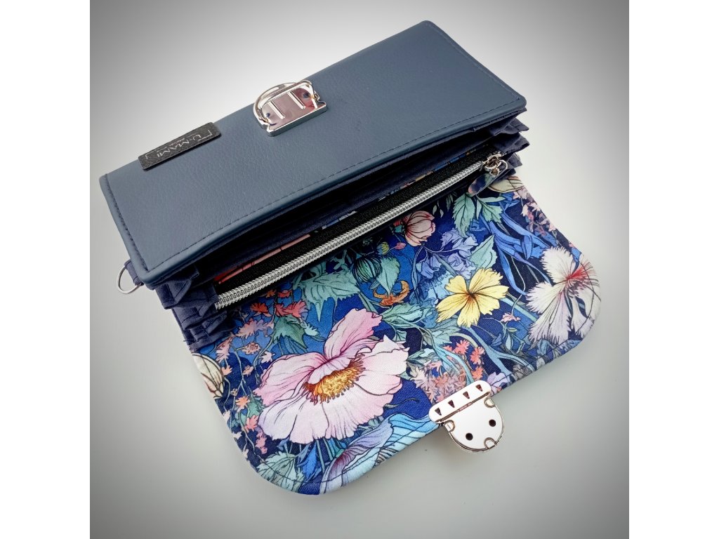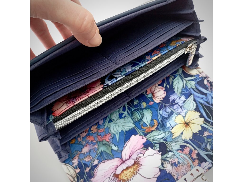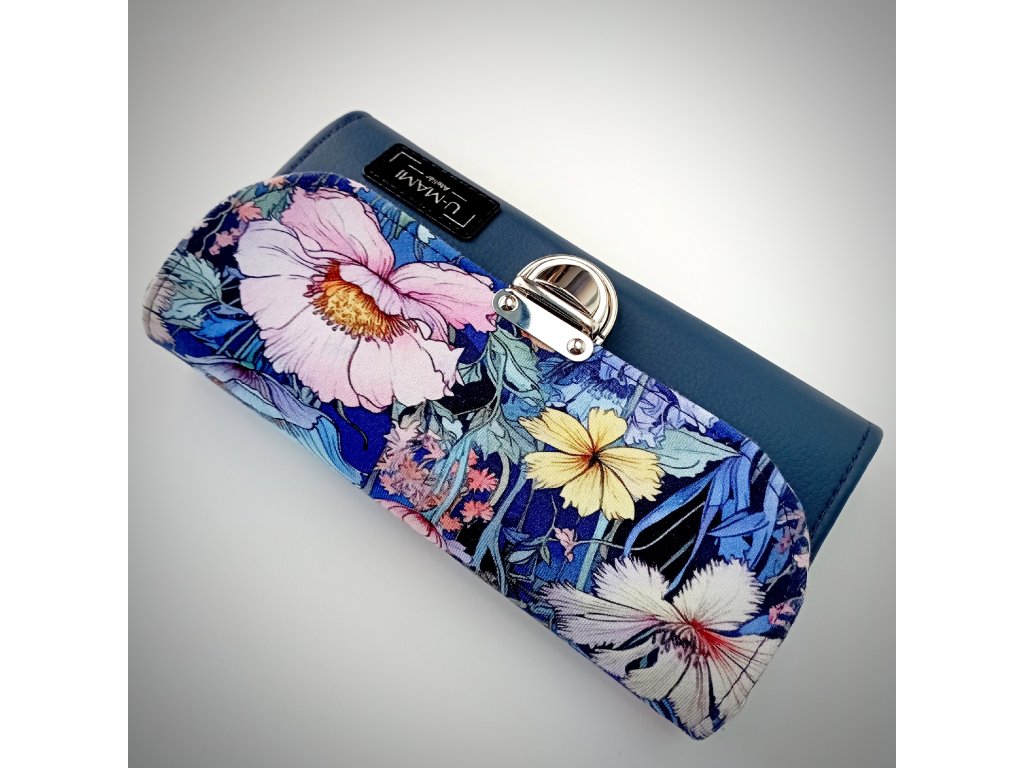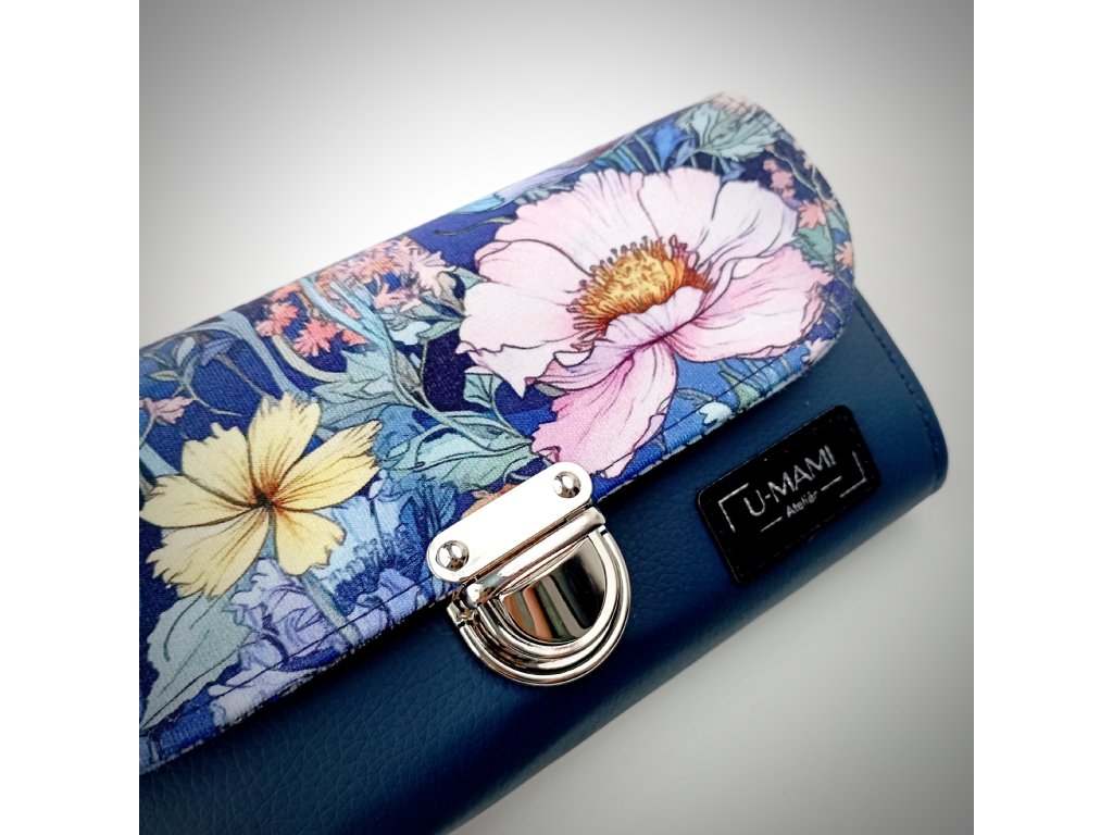 Tato stylová peněženka zaujme především svým jedinečným květinovým motivem, který působí jako malá rozkvetlá zahrada. Klopa je zdobená bohatým vzorem jemných květů v odstínech růžové, bílé a žluté, doplněných o modré a zelené listy. Barevná kombinace vytváří harmonický kontrast s elegantním tmavě modrým základem peněženky.