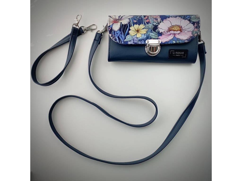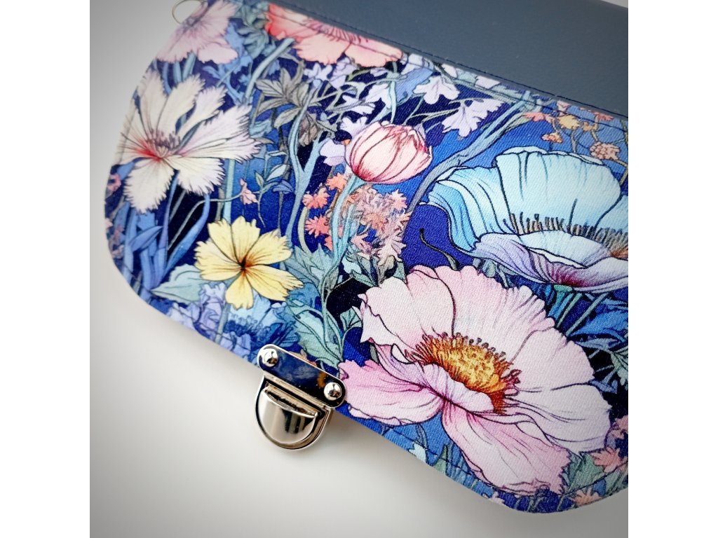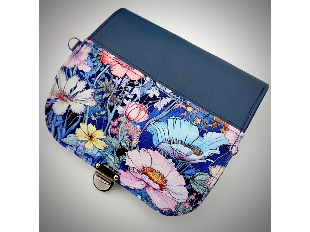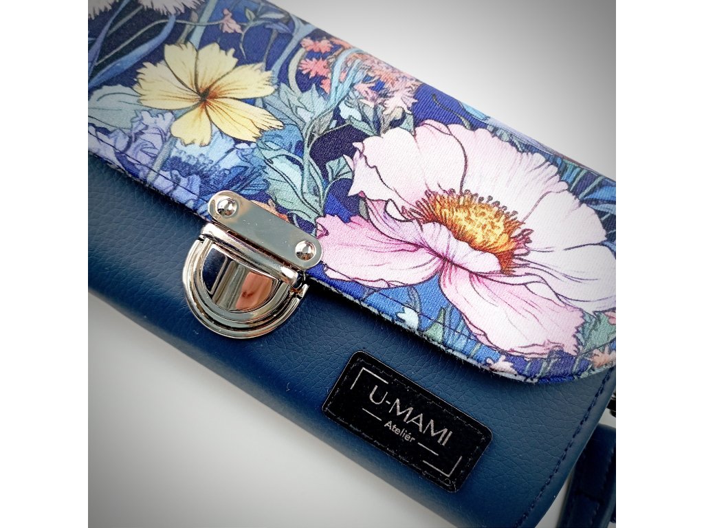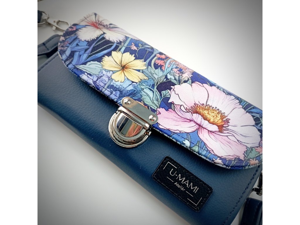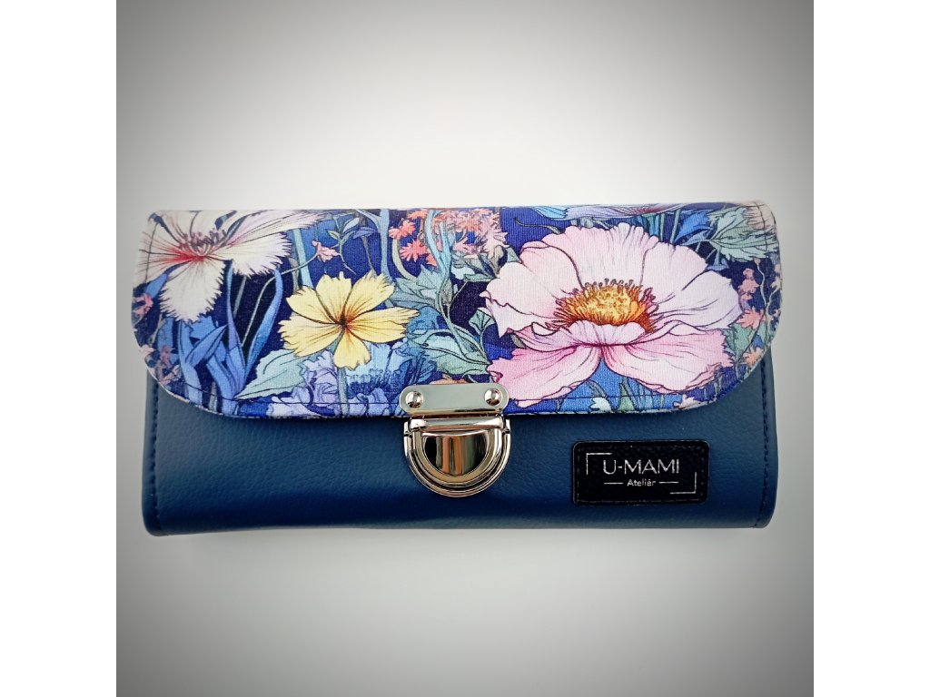 Tato stylová peněženka zaujme především svým jedinečným květinovým motivem, který působí jako malá rozkvetlá zahrada. Klopa je zdobená bohatým vzorem jemných květů v odstínech růžové, bílé a žluté, doplněných o modré a zelené listy. Barevná kombinace vytváří harmonický kontrast s elegantním tmavě modrým základem peněženky.