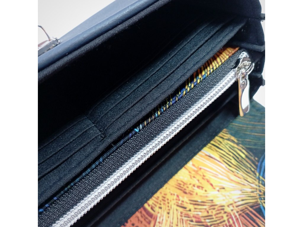 Dynamický motiv: Výrazné spirály a víry v odstínech sluneční žluté, ohnivé oranžové a hluboké indigové modři dodávají peněžence neuvěřitelnou energii a hloubku.