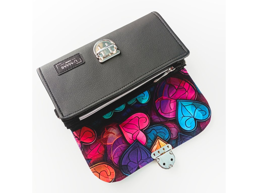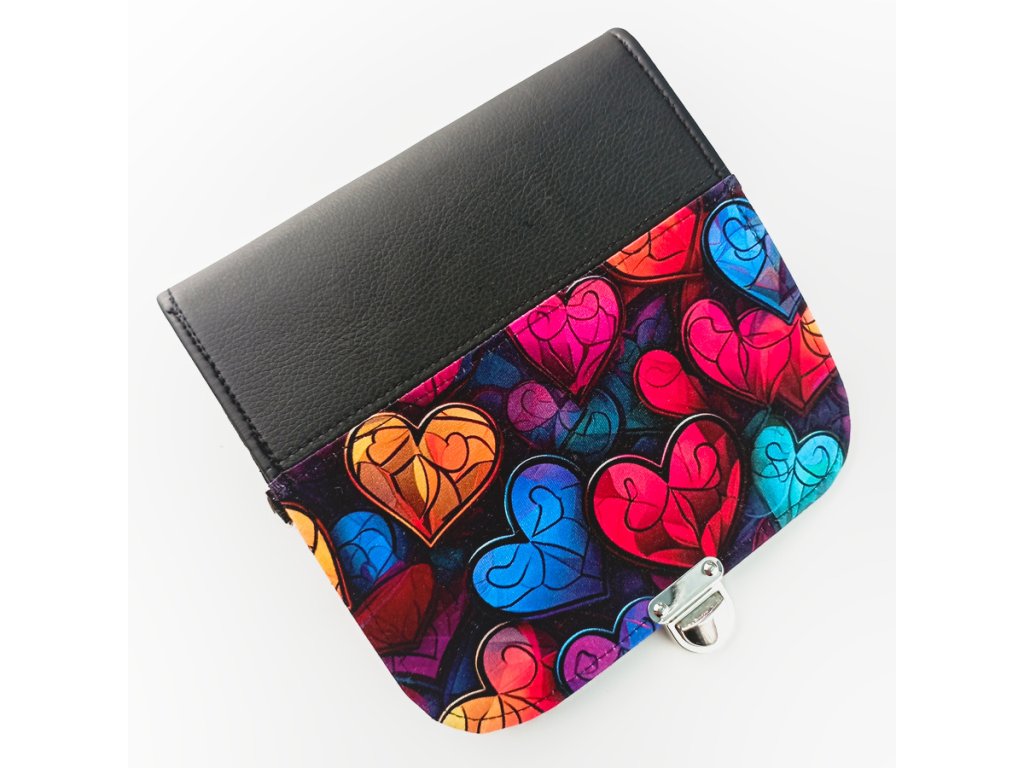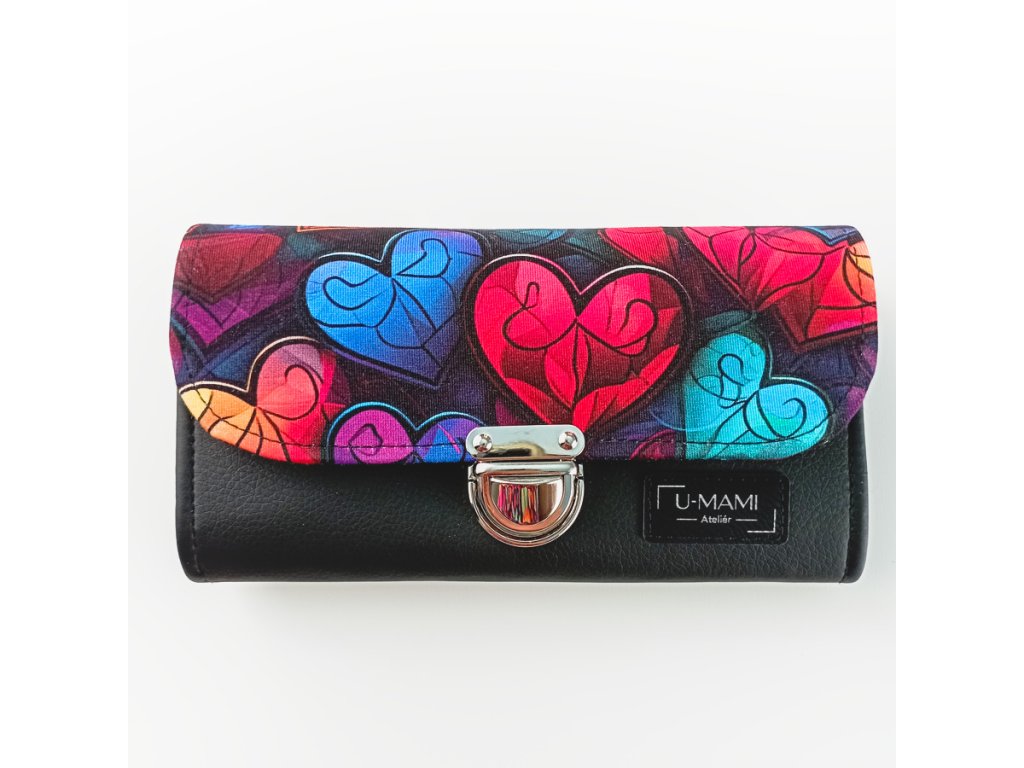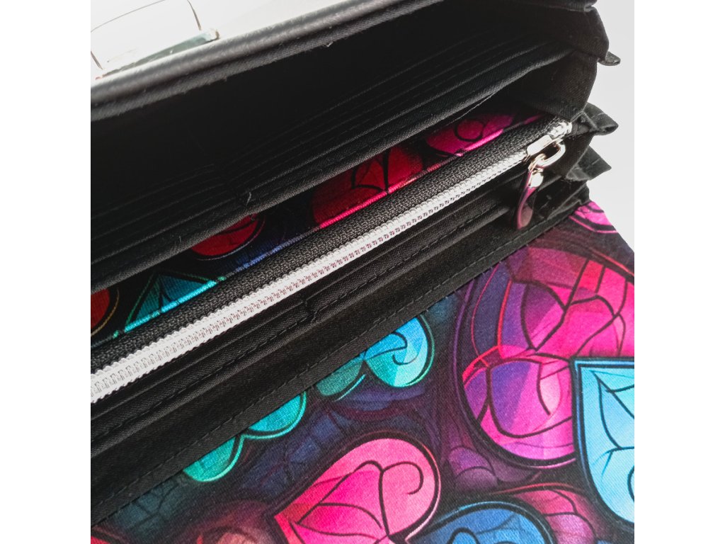Zářivá kombinace barev, která připomíná skleněná vitrážová srdíčka – originální motiv, který z každé peněženky dělá malý umělecký kousek.