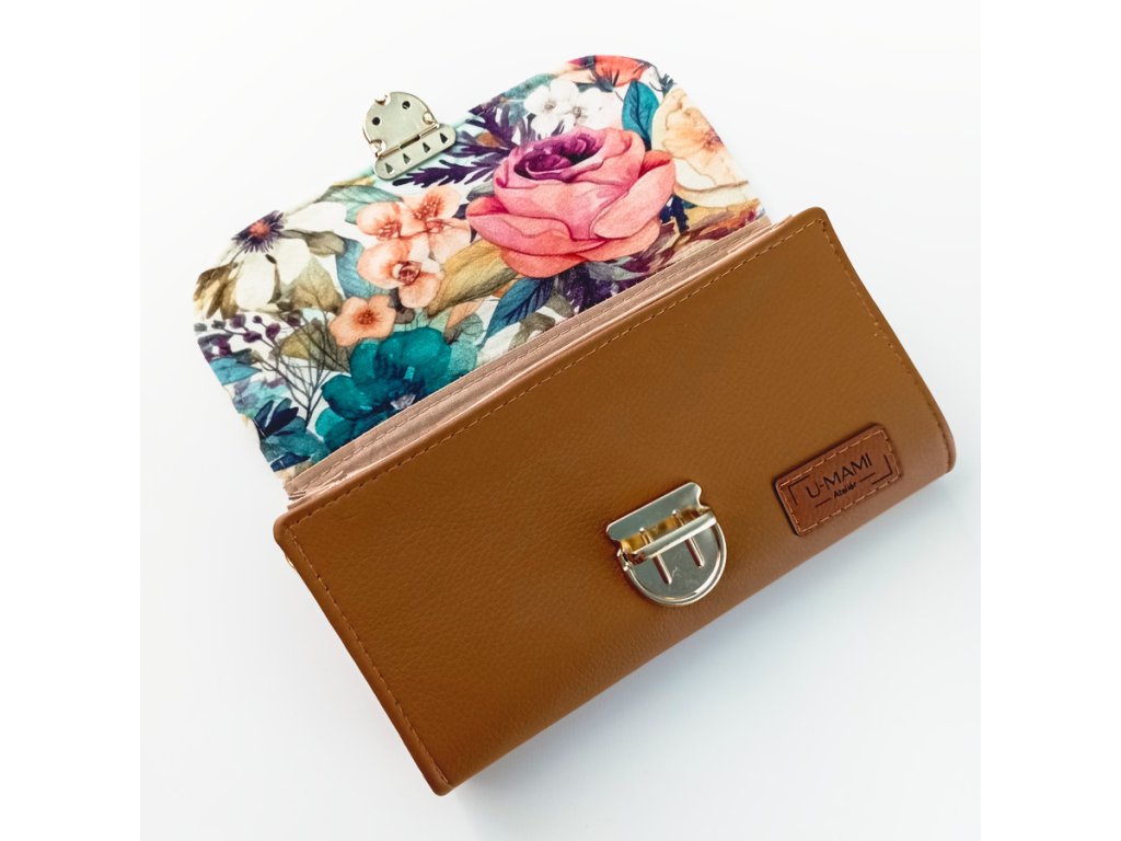 Hladká koženka v karamelovém odstínu celý design ukotvuje a dodává mu elegantní hloubku. Peněženka tak působí jako malý kousek přírody, který můžete nosit stále s sebou.